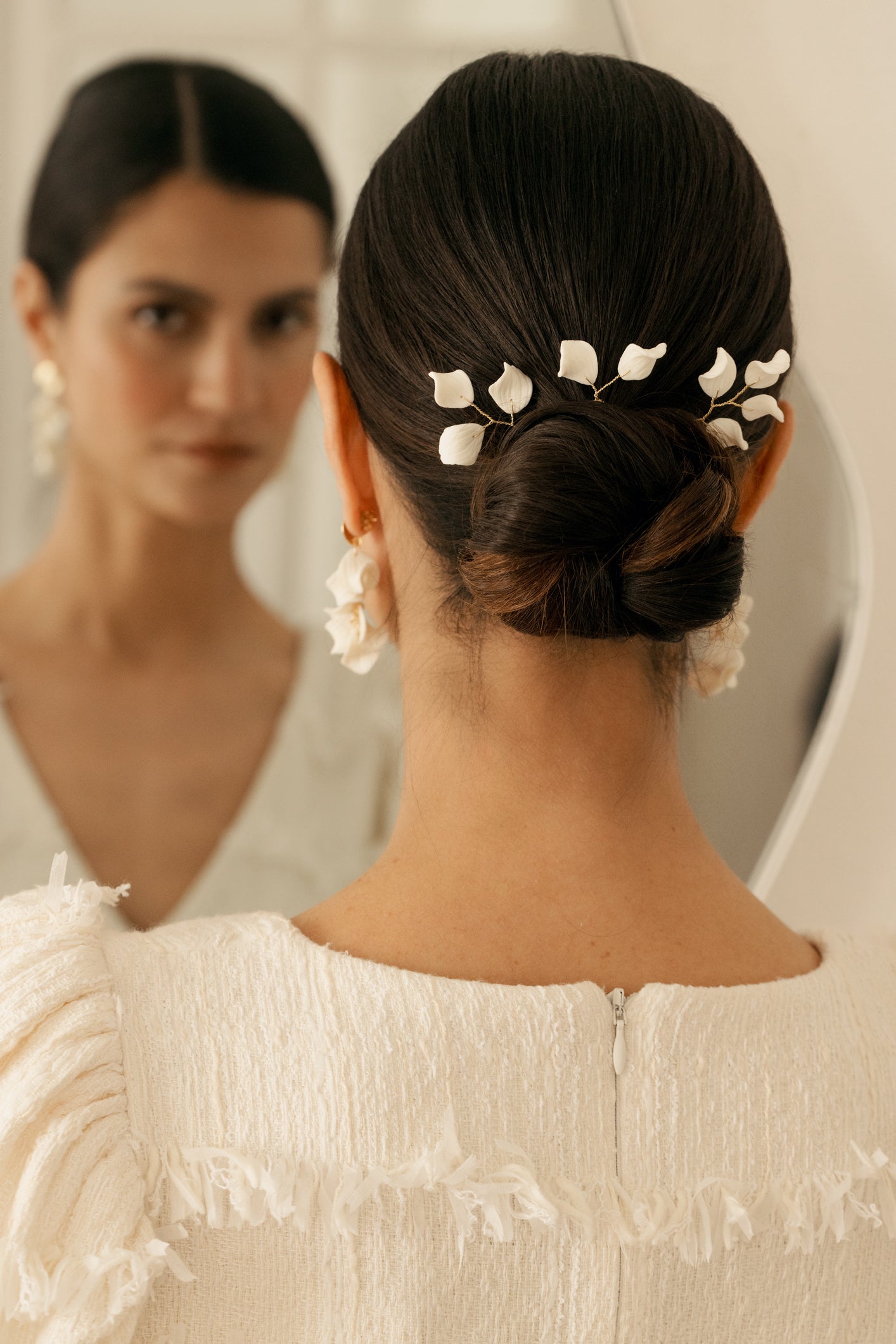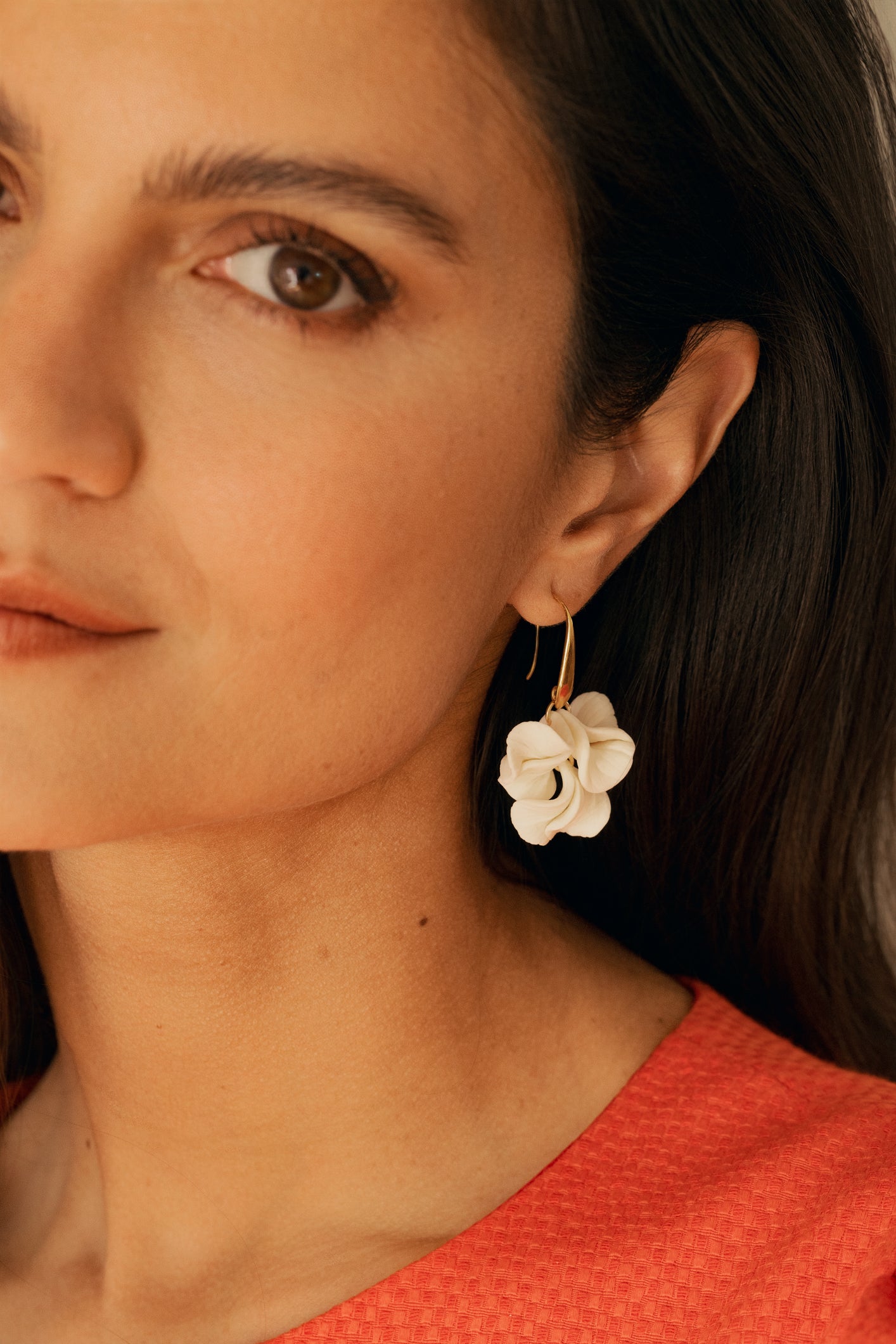 Ces pendants d'oreilles se composent de pétales de fleurs blanches en porcelaine froide finement ciselés.