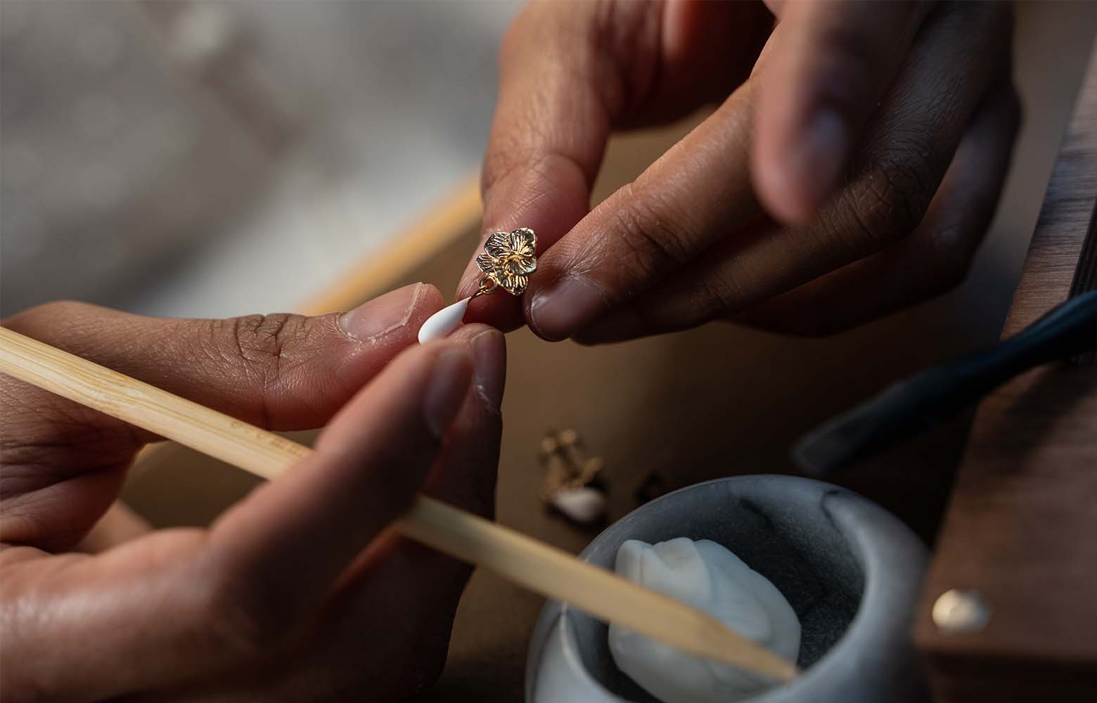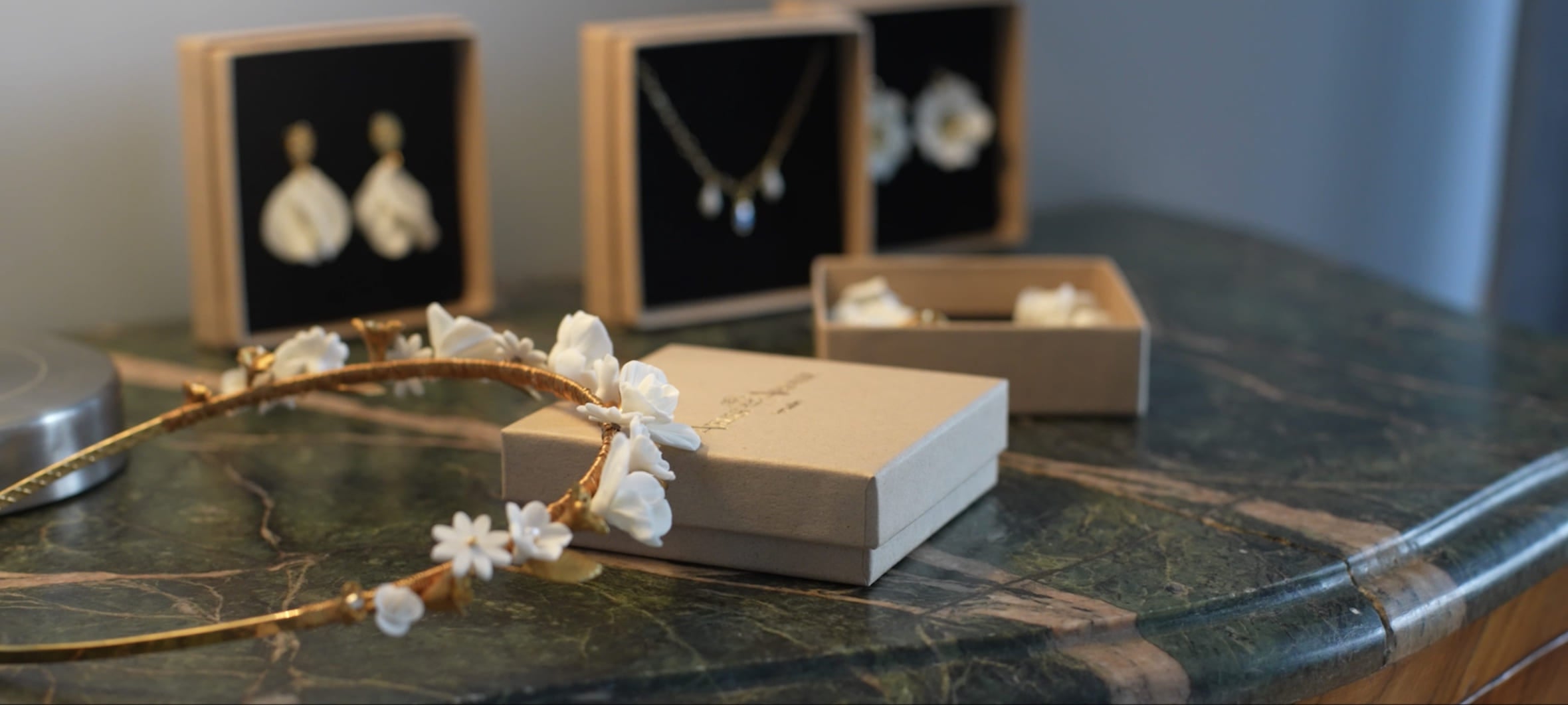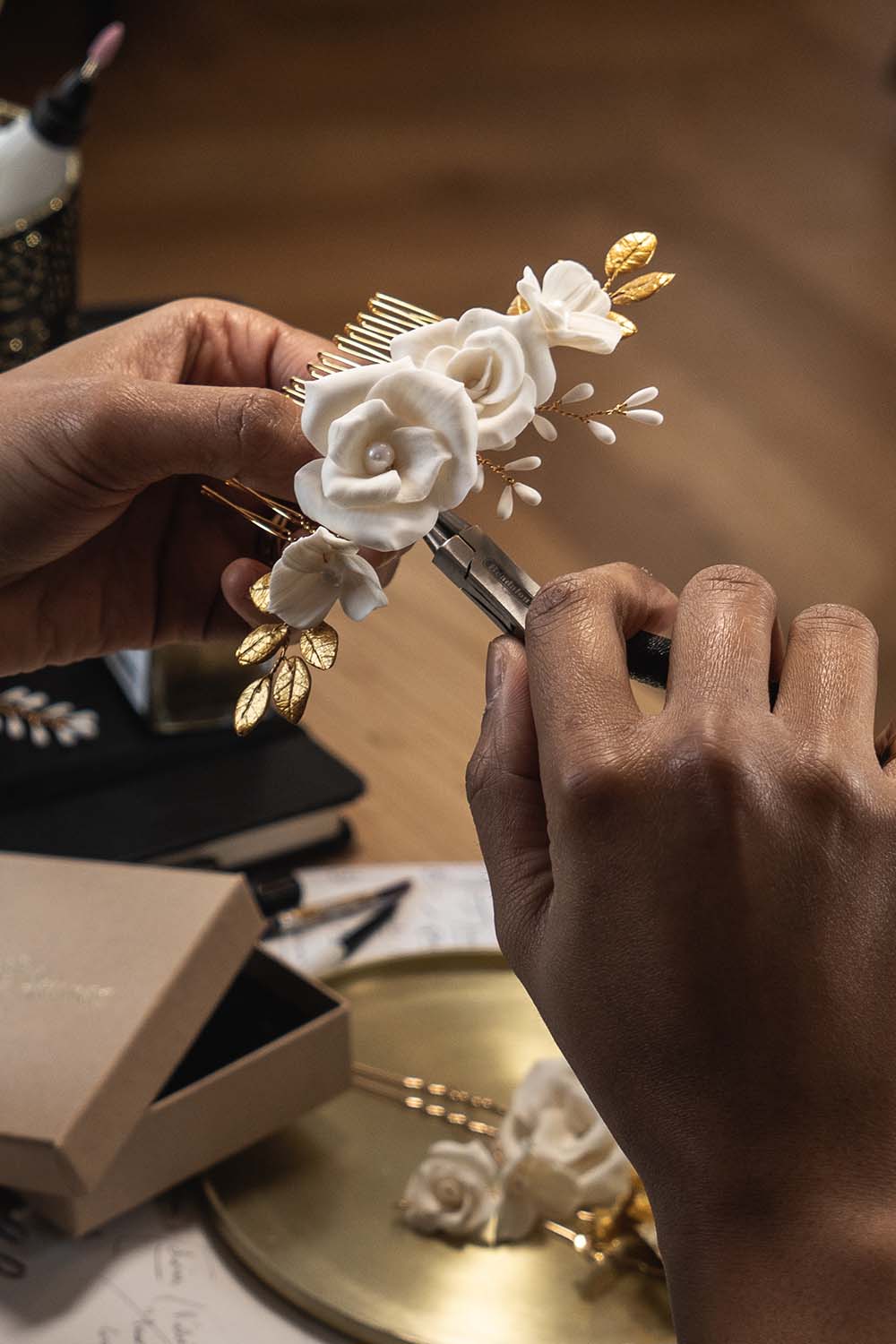 La porcelaine froide que nous utilisons est fabriquée en France et nous permet de laisser libre cours à notre créativité, en créant une multitude de petits détails que vous pouvez voir sur nos bijoux comme les nervures d’un pétale de rose, d’une feuille, les perles…