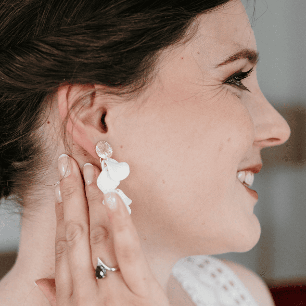 Ces élégantes boucles d'oreilles pendantes en porcelaine froide se composent d’une cascade de pétales de fleurs blancs finement ciselés à la main.