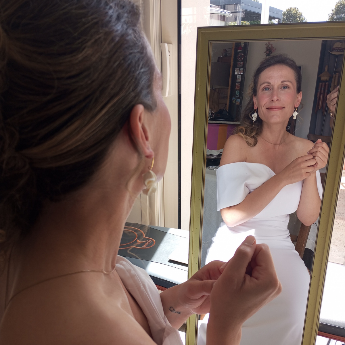 "Grâce a vous je me suis sentie divine lors de mon mariage. Je garde précieusement mes boucles de mariée qui vont m'accompagner dans tous les moments importants de ma vie désormais. Un grand merci"