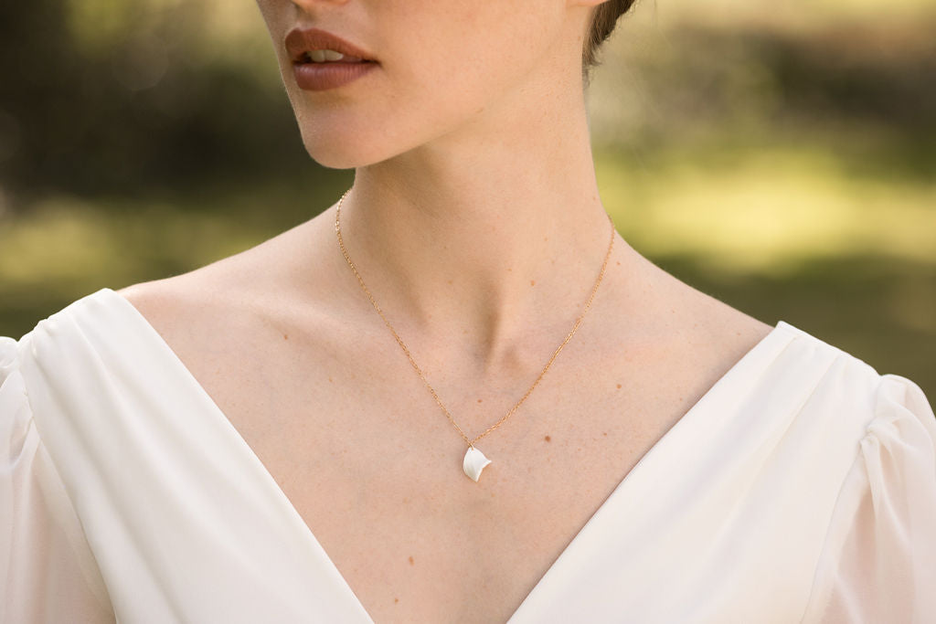 Ce collier de dos de mariée en porcelaine froide est moderne et élégant. Il se compose d'un pétale de fleur délicatement ciselé, suspendu à une fine chaîne en or laminé. La partie avant de ce collier est ornée d'une perle de porcelaine froide sculptée elle aussi à la main.