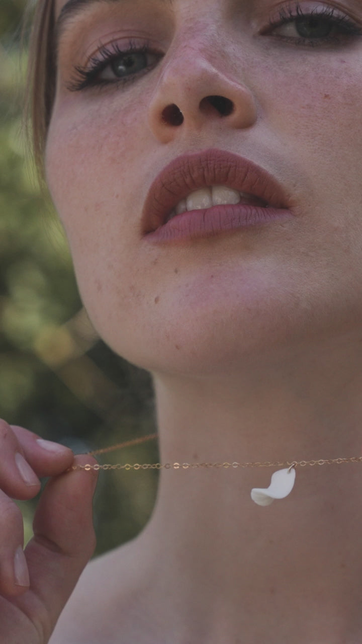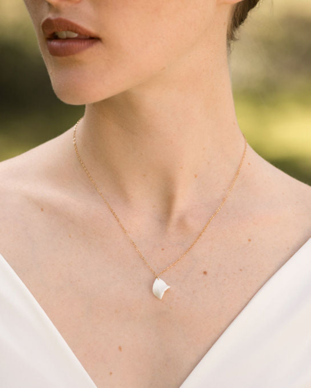 Ce collier de mariage en porcelaine froide est orné d'un pétale de fleur blanche délicatement ouvragé, suspendu à une fine chaîne en or laminé (gold filled) 14 carats.